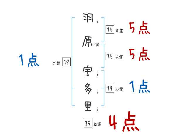 天運![]() | 羽原宇多里さんの天運は16画の5つ星!人望が厚く大きく発展する。逆転成功が見える。 家系が持つ宿命的な運勢を表します。祖先から受け継いだ苗字ですので自分の力が及びません。家柄を象徴します。 |
