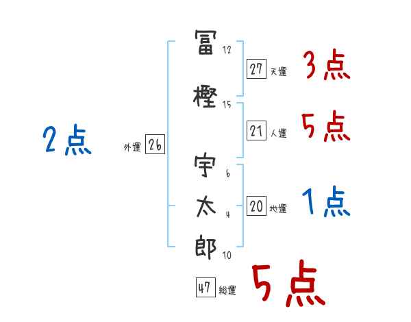 外運![]() | 冨樫宇太郎さんの外運は26画の2つ星!波瀾万丈かも。信頼できる人を大事にしましょう。 生活面を象徴する運勢です。外部から受ける影響力を表し、結婚運、家庭運や職場、環境への順応性を表します。 |