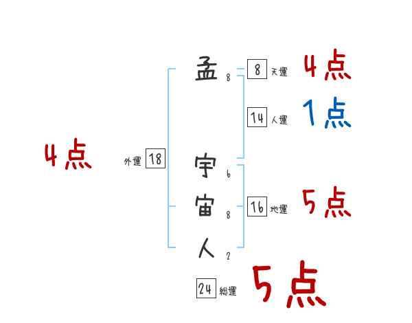 外運![]() | 孟宇宙人さんの外運は18画の4つ星!情熱的で剛気。忍耐力があり信頼される。 生活面を象徴する運勢です。外部から受ける影響力を表し、結婚運、家庭運や職場、環境への順応性を表します。 |