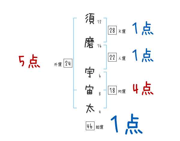 天運![]() | 須磨宇宙太さんの天運は28画の1つ星!家庭環境に注意。スポーツで活躍できる能力があるかも。 家系が持つ宿命的な運勢を表します。祖先から受け継いだ苗字ですので自分の力が及びません。家柄を象徴します。 |