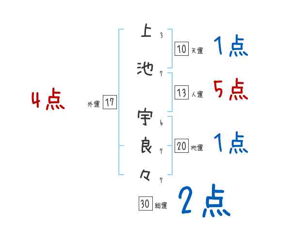 外運![]() | 上池宇良々さんの外運は17画の4つ星!積極的な行動力。地位を気づき財産を手に入れる。純粋な心と直感力。 生活面を象徴する運勢です。外部から受ける影響力を表し、結婚運、家庭運や職場、環境への順応性を表します。 |