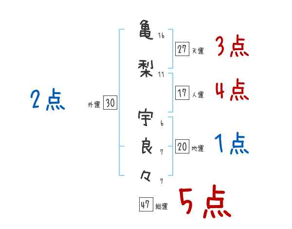 総運![]() | 亀梨宇良々さんの総運は47画の5つ星!実力が開花し発展する円満な人生。財に恵まれる。 あなたの人生を表す1番重要な運勢です。生涯を通じて影響する総合運となり、主に50歳以降の晩年期に影響を及ぼします。 |