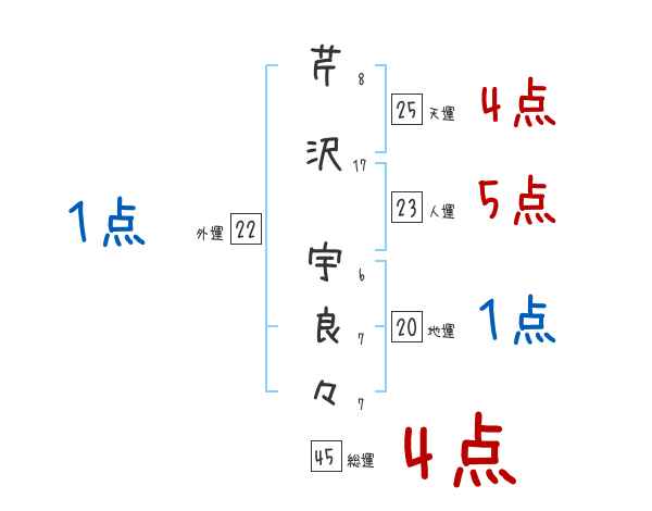 総運![]() | 芹沢宇良々さんの総運は45画の4つ星!もくもくと物事を進め達成する。地味な努力家。 あなたの人生を表す1番重要な運勢です。生涯を通じて影響する総合運となり、主に50歳以降の晩年期に影響を及ぼします。 |