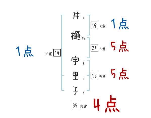 外運![]() | 井樋宇里子さんの外運は14画の1つ星!人に対して優しいがストレスを溜め込みがち。人間関係のトラブルを避けるよう気をつけましょう。 生活面を象徴する運勢です。外部から受ける影響力を表し、結婚運、家庭運や職場、環境への順応性を表します。 |