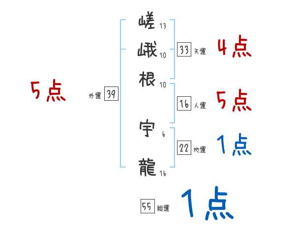 外運![]() | 嵯峨根宇龍さんの外運は39画の5つ星!社交性に優れ人望が厚い。人の上に立ち成功する。 生活面を象徴する運勢です。外部から受ける影響力を表し、結婚運、家庭運や職場、環境への順応性を表します。 |