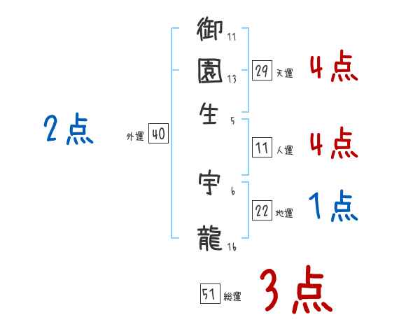 総運![]() | 御園生宇龍さんの総運は51画の3つ星!変化が激しく、危険に注意。堅実な性格。 あなたの人生を表す1番重要な運勢です。生涯を通じて影響する総合運となり、主に50歳以降の晩年期に影響を及ぼします。 |