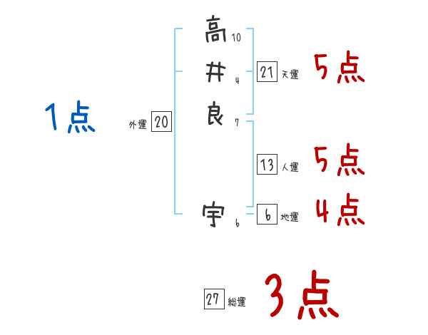 天運![]() | 高井良宇さんの天運は21画の5つ星!統率力がある。独立し成功する。名誉を手に入れる。 家系が持つ宿命的な運勢を表します。祖先から受け継いだ苗字ですので自分の力が及びません。家柄を象徴します。 |