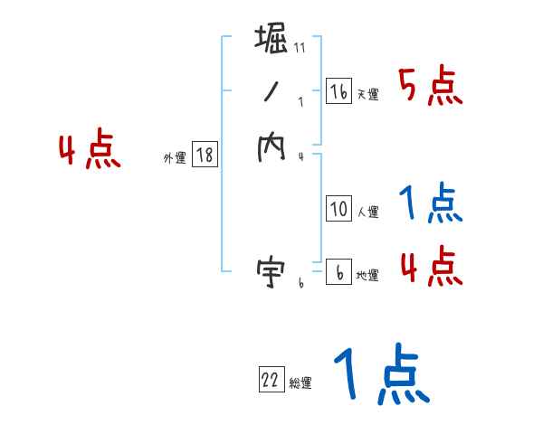 天運![]() | 堀ノ内宇さんの天運は16画の5つ星!人望が厚く大きく発展する。逆転成功が見える。 家系が持つ宿命的な運勢を表します。祖先から受け継いだ苗字ですので自分の力が及びません。家柄を象徴します。 |