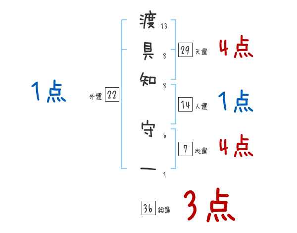 総運![]() | 渡具知守一さんの総運は36画の3つ星!先見性が豊かです。多少神経質で苦労することも。 あなたの人生を表す1番重要な運勢です。生涯を通じて影響する総合運となり、主に50歳以降の晩年期に影響を及ぼします。 |