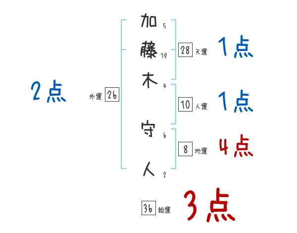 総運![]() | 加藤木守人さんの総運は36画の3つ星!先見性が豊かです。多少神経質で苦労することも。 あなたの人生を表す1番重要な運勢です。生涯を通じて影響する総合運となり、主に50歳以降の晩年期に影響を及ぼします。 |