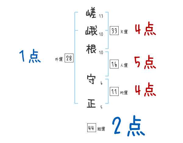 人運![]() | 嵯峨根守正さんの人運は16画の5つ星!人望が厚く大きく発展する。逆転成功が見える。 性格や才能などを表す2番目に重要な運勢です。人間関係や協調性、社会的な成功に影響します。主に20歳から50歳ぐらいまでの中年期の運勢を表します。 |