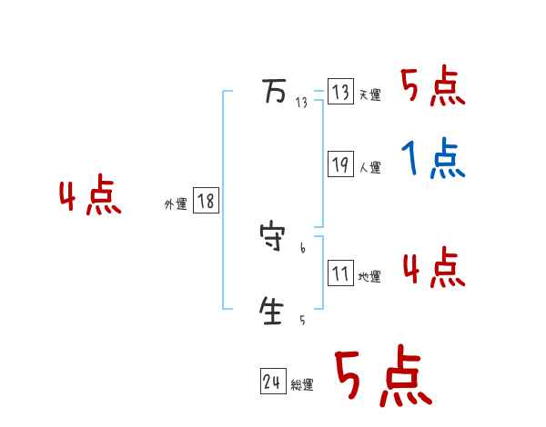 総運![]() | 万守生さんの総運は24画の5つ星!家庭運が良く順調な人生。金運にも恵まれる。 あなたの人生を表す1番重要な運勢です。生涯を通じて影響する総合運となり、主に50歳以降の晩年期に影響を及ぼします。 |