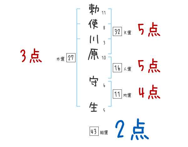 総運![]() | 勅使川原守生さんの総運は43画の2つ星!頑固な性格で独立心が強いかも。やや非現実的で浪費に注意しましょう。 あなたの人生を表す1番重要な運勢です。生涯を通じて影響する総合運となり、主に50歳以降の晩年期に影響を及ぼします。 |