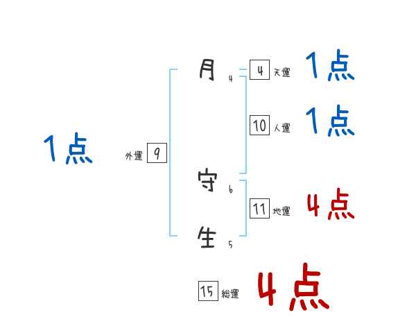 天運![]() | 月守生さんの天運は4画の1つ星!感情が不安定で苦労するかも。周囲との協調を心掛けましょう。 家系が持つ宿命的な運勢を表します。祖先から受け継いだ苗字ですので自分の力が及びません。家柄を象徴します。 |