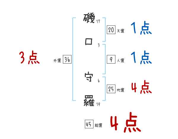 外運![]() | 磯口守羅さんの外運は36画の3つ星!先見性が豊かです。多少神経質で苦労することも。 生活面を象徴する運勢です。外部から受ける影響力を表し、結婚運、家庭運や職場、環境への順応性を表します。 |