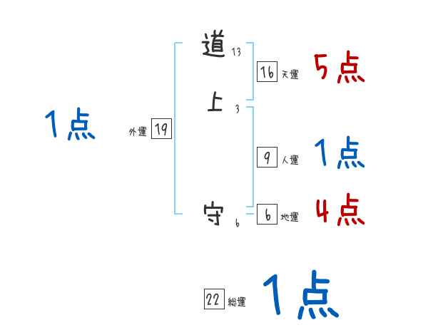 天運![]() | 道上守さんの天運は16画の5つ星!人望が厚く大きく発展する。逆転成功が見える。 家系が持つ宿命的な運勢を表します。祖先から受け継いだ苗字ですので自分の力が及びません。家柄を象徴します。 |