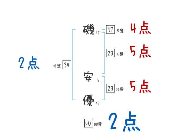 人運![]() | 磯安優さんの人運は23画の5つ星!想像力に優れ活力がある。一代で成功し名誉を手に入れる。 性格や才能などを表す2番目に重要な運勢です。人間関係や協調性、社会的な成功に影響します。主に20歳から50歳ぐらいまでの中年期の運勢を表します。 |