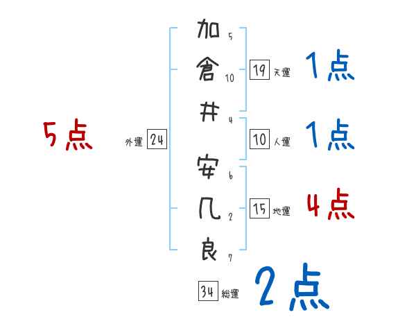 外運![]() | 加倉井安几良さんの外運は24画の5つ星!家庭運が良く順調な人生。金運にも恵まれる。 生活面を象徴する運勢です。外部から受ける影響力を表し、結婚運、家庭運や職場、環境への順応性を表します。 |