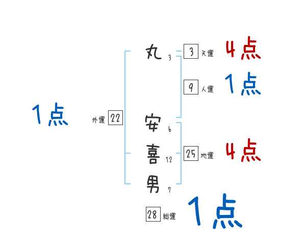 総運![]() | 丸安喜男さんの総運は28画の1つ星!家庭環境に注意。スポーツで活躍できる能力があるかも。 あなたの人生を表す1番重要な運勢です。生涯を通じて影響する総合運となり、主に50歳以降の晩年期に影響を及ぼします。 |