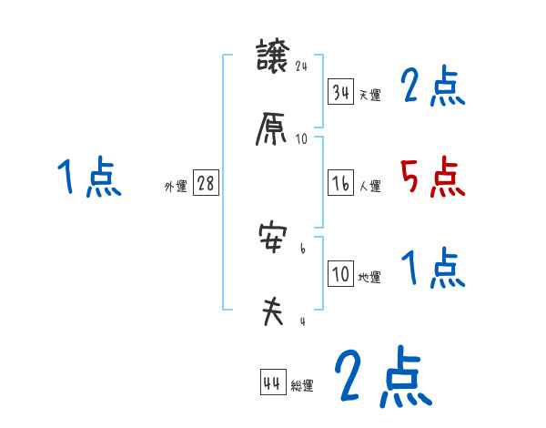 人運![]() | 譲原安夫さんの人運は16画の5つ星!人望が厚く大きく発展する。逆転成功が見える。 性格や才能などを表す2番目に重要な運勢です。人間関係や協調性、社会的な成功に影響します。主に20歳から50歳ぐらいまでの中年期の運勢を表します。 |