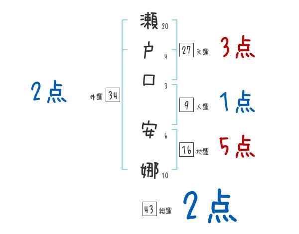 天運![]() | 瀬戸口安娜さんの天運は27画の3つ星!頭脳明晰だが強情で摩擦が多い傾向。孤立に注意。 家系が持つ宿命的な運勢を表します。祖先から受け継いだ苗字ですので自分の力が及びません。家柄を象徴します。 |