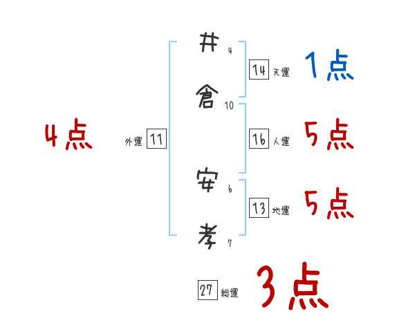 人運![]() | 井倉安孝さんの人運は16画の5つ星!人望が厚く大きく発展する。逆転成功が見える。 性格や才能などを表す2番目に重要な運勢です。人間関係や協調性、社会的な成功に影響します。主に20歳から50歳ぐらいまでの中年期の運勢を表します。 |