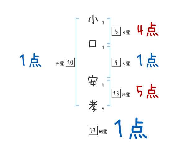 天運![]() | 小口安孝さんの天運は6画の4つ星!慎重な努力家で信頼を得る。誠実な精神で向上心に優れる。 家系が持つ宿命的な運勢を表します。祖先から受け継いだ苗字ですので自分の力が及びません。家柄を象徴します。 |