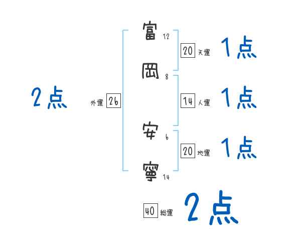 総運![]() | 富岡安寧さんの総運は40画の2つ星!自信過剰で物事に固執するためトラブルに注意。 あなたの人生を表す1番重要な運勢です。生涯を通じて影響する総合運となり、主に50歳以降の晩年期に影響を及ぼします。 |