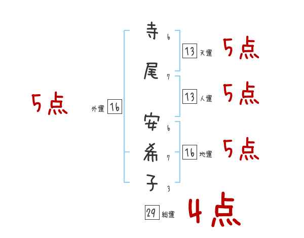 外運![]() | 寺尾安希子さんの外運は16画の5つ星!人望が厚く大きく発展する。逆転成功が見える。 生活面を象徴する運勢です。外部から受ける影響力を表し、結婚運、家庭運や職場、環境への順応性を表します。 |