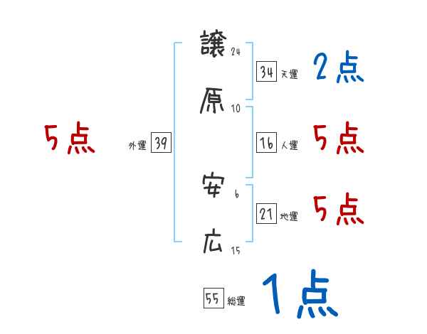 外運![]() | 譲原安広さんの外運は39画の5つ星!社交性に優れ人望が厚い。人の上に立ち成功する。 生活面を象徴する運勢です。外部から受ける影響力を表し、結婚運、家庭運や職場、環境への順応性を表します。 |