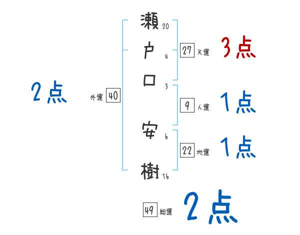 天運![]() | 瀬戸口安樹さんの天運は27画の3つ星!頭脳明晰だが強情で摩擦が多い傾向。孤立に注意。 家系が持つ宿命的な運勢を表します。祖先から受け継いだ苗字ですので自分の力が及びません。家柄を象徴します。 |