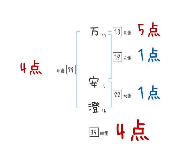総運![]() | 万安澄さんの総運は35画の4つ星!温厚な性格で感受性が高い。穏和な性格で人望が厚い。 あなたの人生を表す1番重要な運勢です。生涯を通じて影響する総合運となり、主に50歳以降の晩年期に影響を及ぼします。 |