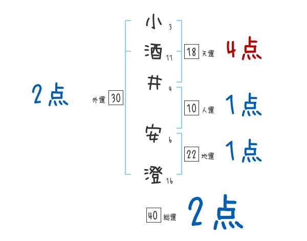 天運![]() | 小酒井安澄さんの天運は18画の4つ星!情熱的で剛気。忍耐力があり信頼される。 家系が持つ宿命的な運勢を表します。祖先から受け継いだ苗字ですので自分の力が及びません。家柄を象徴します。 |