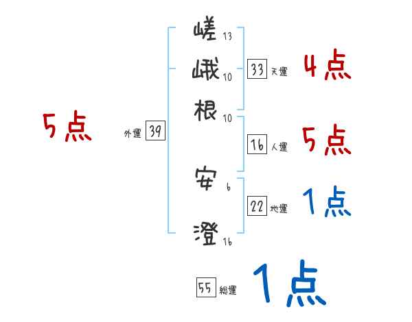 人運![]() | 嵯峨根安澄さんの人運は16画の5つ星!人望が厚く大きく発展する。逆転成功が見える。 性格や才能などを表す2番目に重要な運勢です。人間関係や協調性、社会的な成功に影響します。主に20歳から50歳ぐらいまでの中年期の運勢を表します。 |