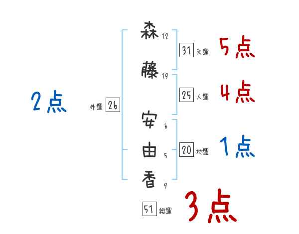 天運![]() | 森藤安由香さんの天運は31画の5つ星!社交性があり判断力に優れる。順風満帆な人生で円満な生活。 家系が持つ宿命的な運勢を表します。祖先から受け継いだ苗字ですので自分の力が及びません。家柄を象徴します。 |