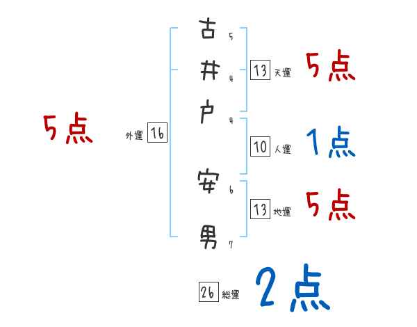 外運![]() | 古井戸安男さんの外運は16画の5つ星!人望が厚く大きく発展する。逆転成功が見える。 生活面を象徴する運勢です。外部から受ける影響力を表し、結婚運、家庭運や職場、環境への順応性を表します。 |