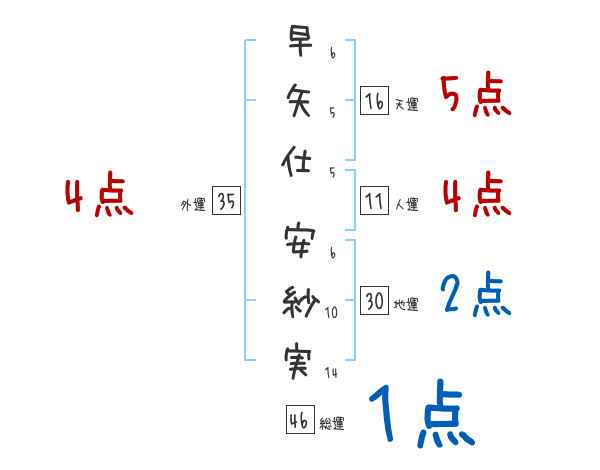 外運![]() | 早矢仕安紗実さんの外運は35画の4つ星!温厚な性格で感受性が高い。穏和な性格で人望が厚い。 生活面を象徴する運勢です。外部から受ける影響力を表し、結婚運、家庭運や職場、環境への順応性を表します。 |
