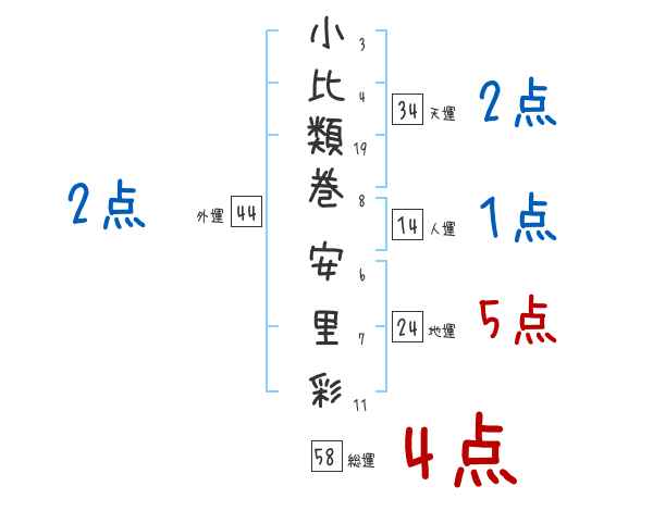 外運![]() | 小比類巻安里彩さんの外運は44画の2つ星!誠実で慎重な性格。物事を考えすぎないように注意しましょう。 生活面を象徴する運勢です。外部から受ける影響力を表し、結婚運、家庭運や職場、環境への順応性を表します。 |