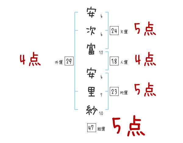 総運![]() | 安次富安里紗さんの総運は47画の5つ星!実力が開花し発展する円満な人生。財に恵まれる。 あなたの人生を表す1番重要な運勢です。生涯を通じて影響する総合運となり、主に50歳以降の晩年期に影響を及ぼします。 |