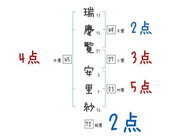 天運![]() | 瑞慶覧安里紗さんの天運は49画の2つ星!不安定な性格で明暗がある人生。周りの人には支援されやすい。 家系が持つ宿命的な運勢を表します。祖先から受け継いだ苗字ですので自分の力が及びません。家柄を象徴します。 |