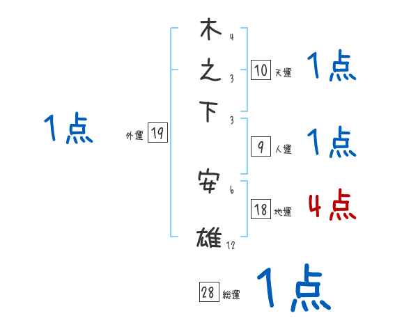 天運![]() | 木之下安雄さんの天運は10画の1つ星!不安を感じやすい傾向。ストレスを抱えないように注意しましょう。 家系が持つ宿命的な運勢を表します。祖先から受け継いだ苗字ですので自分の力が及びません。家柄を象徴します。 |