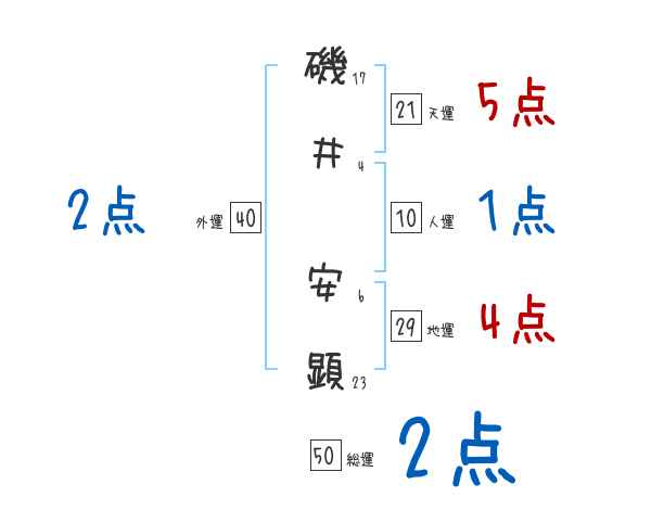 天運![]() | 磯井安顕さんの天運は21画の5つ星!統率力がある。独立し成功する。名誉を手に入れる。 家系が持つ宿命的な運勢を表します。祖先から受け継いだ苗字ですので自分の力が及びません。家柄を象徴します。 |