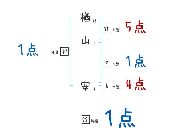 天運![]() | 楢山安さんの天運は16画の5つ星!人望が厚く大きく発展する。逆転成功が見える。 家系が持つ宿命的な運勢を表します。祖先から受け継いだ苗字ですので自分の力が及びません。家柄を象徴します。 |
