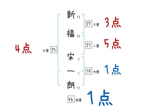 天運![]() | 新福宋一朗さんの天運は27画の3つ星!頭脳明晰だが強情で摩擦が多い傾向。孤立に注意。 家系が持つ宿命的な運勢を表します。祖先から受け継いだ苗字ですので自分の力が及びません。家柄を象徴します。 |