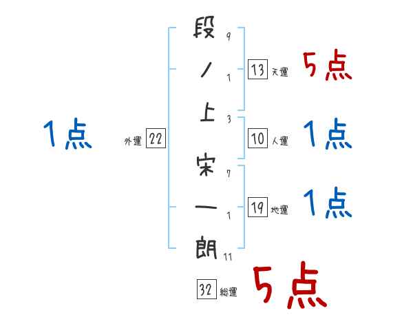 外運![]() | 段ノ上宋一朗さんの外運は22画の1つ星!努力することが苦手ないっぽう手先が器用。芸術性にも優れる。 生活面を象徴する運勢です。外部から受ける影響力を表し、結婚運、家庭運や職場、環境への順応性を表します。 |