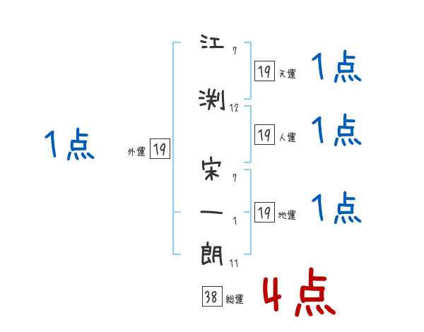 外運![]() | 江渕宋一朗さんの外運は19画の1つ星!優れた才能を持ちますが、協調性が足りないことも。周りの人と協力する事を意識しましょう。 生活面を象徴する運勢です。外部から受ける影響力を表し、結婚運、家庭運や職場、環境への順応性を表します。 |