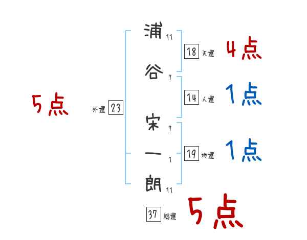 外運![]() | 浦谷宋一朗さんの外運は23画の5つ星!想像力に優れ活力がある。一代で成功し名誉を手に入れる。 生活面を象徴する運勢です。外部から受ける影響力を表し、結婚運、家庭運や職場、環境への順応性を表します。 |
