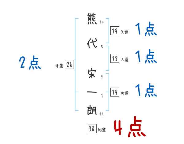 天運![]() | 熊代宋一朗さんの天運は19画の1つ星!優れた才能を持ちますが、協調性が足りないことも。周りの人と協力する事を意識しましょう。 家系が持つ宿命的な運勢を表します。祖先から受け継いだ苗字ですので自分の力が及びません。家柄を象徴します。 |