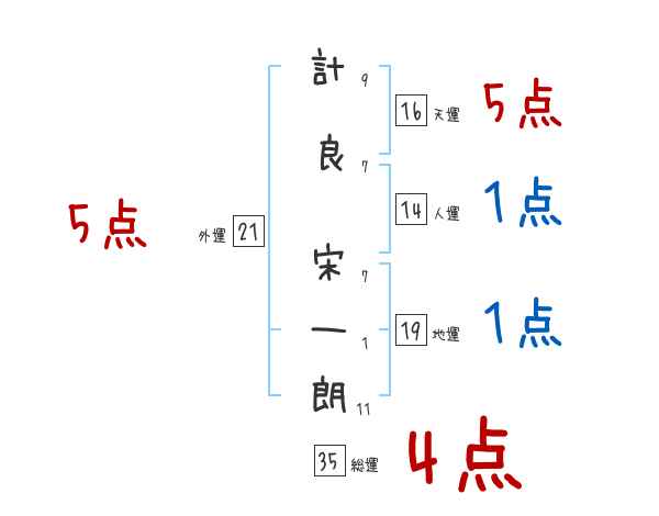 天運![]() | 計良宋一朗さんの天運は16画の5つ星!人望が厚く大きく発展する。逆転成功が見える。 家系が持つ宿命的な運勢を表します。祖先から受け継いだ苗字ですので自分の力が及びません。家柄を象徴します。 |