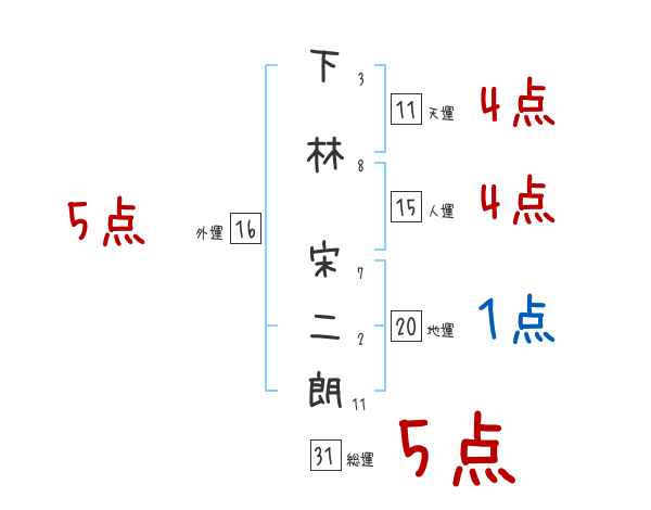 天運![]() | 下林宋二朗さんの天運は11画の4つ星!着実に富や地位を得る幸運な人生。 家系が持つ宿命的な運勢を表します。祖先から受け継いだ苗字ですので自分の力が及びません。家柄を象徴します。 |